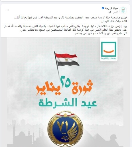 هنأت مؤسسة حياة كريمة، الشعب المصري، بمناسبة حلول ذكرى ثورة 25 يناير وأيضًا عيد الشرطة.