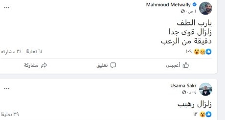 وفي هذا الصدد، دون محمد متولي عن لحظات الرعب الذي عاشها جراء شعوره بتلك الهزة قائلًا: "يا رب استرها زلزال قوي جدًا، دقيقة من الرعب".