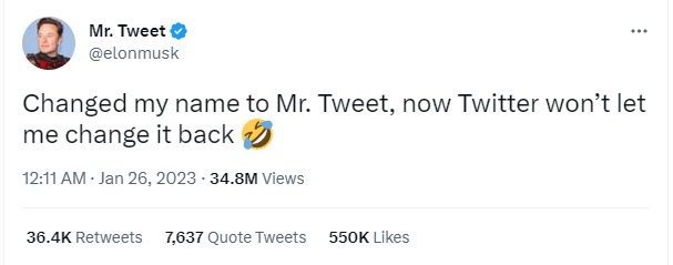 وغرد إيلون ماسك برمز تعبيري ضاحك أنه غيّر اسمه على موقع تويتر Twitter الخاص به إلى Mr. Tweet، كاتبًا: غيرت اسمي إلى السيد تويت، والآن لن يسمح لي تويتر بتغييره مرة أخرى.