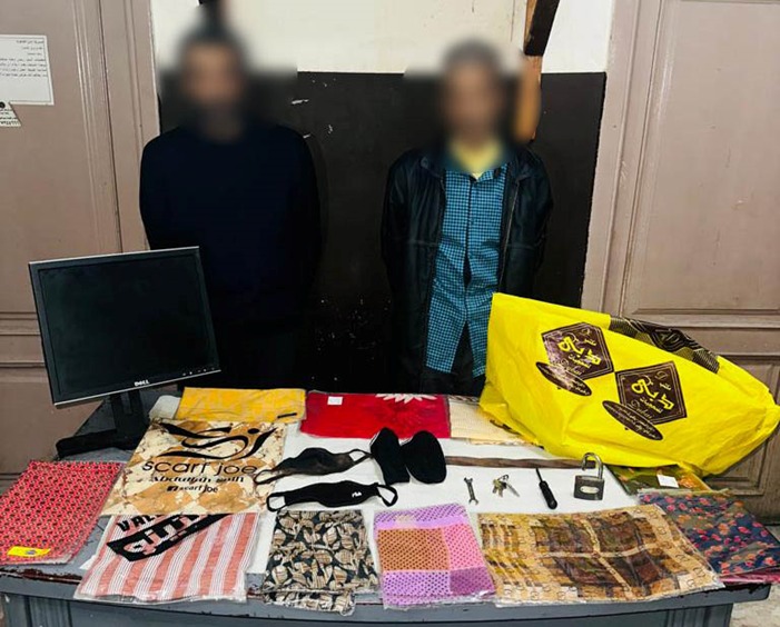 وألقت الأجهزة الأمنية القبض على شخصين لأحدهما معلومات جنائية مقيمان بدائرة قسم شرطة الساحل، وبحوزتهما 2 حقيبة بداخلهما 15 قطعة ملابس، وشاشة كمبيوتر مجهولة المصدر وأجنة ومفك ومجموعة مفاتيح جوارب وكمامات، وبمواجهتهما اعترفا بسرقة محل ملابس كائن بدائرة قسم شرطة مصر الجديدة بأسلوب كسر القفل باستخدام الأدوات المضبوطة بحوزتهما.