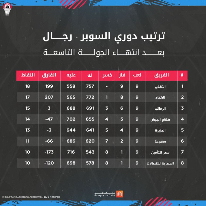 وتذيل فريق المصرية للاتصالات جدول ترتيب الفرق من الأول حتى الثامن، بعد أداء متذبذب خلال منافسات دوري السوبر للمحترفين لكرة السلة.