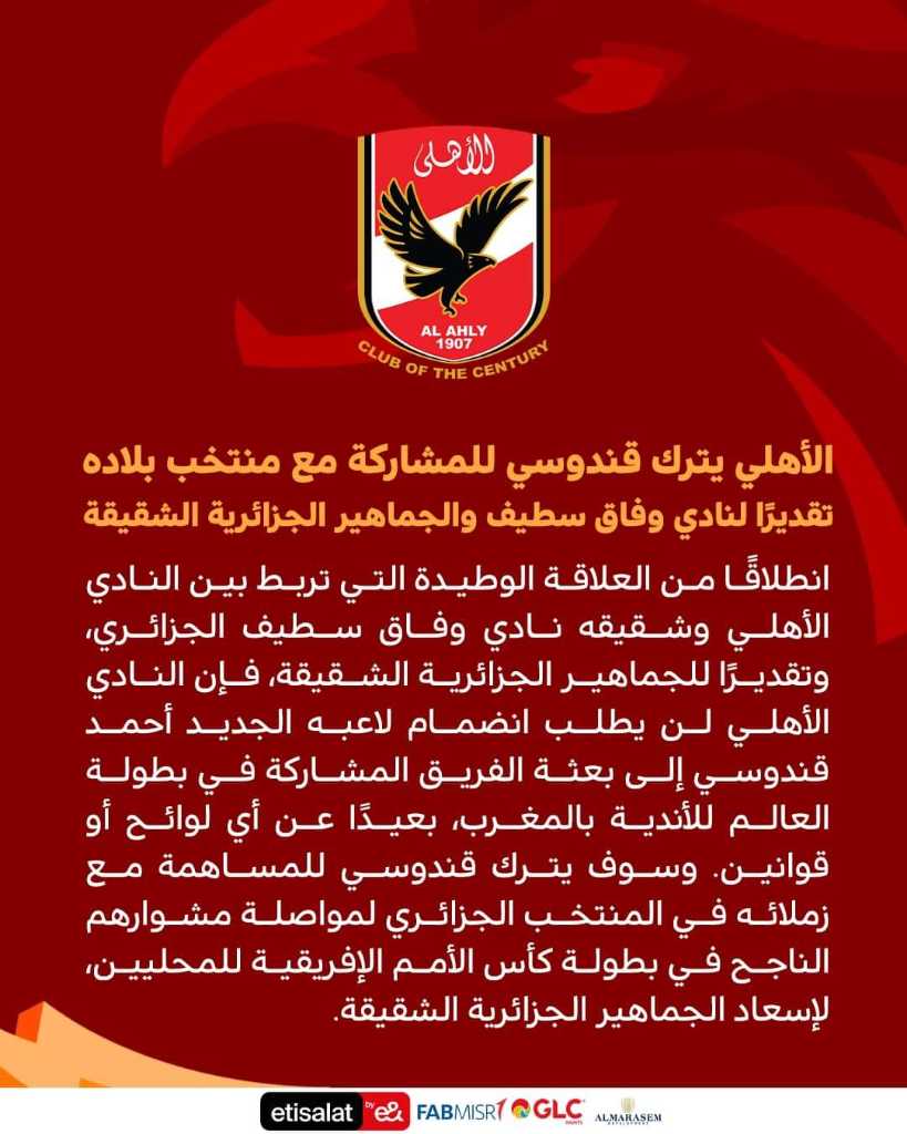 انطلاقًا العلاقة الوطيدة التي تربط بين النادي الأهلي وشقيقه نادي وفاق سطيف الجزائري، وتقديرًا للجماهير الجزائرية الشقيقة، فإن النادي الأهلي لن يطلب انضمام لاعبه الجديد أحمد قندوسي إلى بعثة الفريق المشاركة في بطولة العالم للأندية بالمغرب، بعيدًا عن أي لوائح أو قوانين وسوف يترك قندوسي للمساهمة مع زملائه في المنتخب الجزائري لمواصلة مشوارهم الناجح في بطولة كأس الأمم الإفريقية للمحليين لإسعاد الجماهير الجزائرية الشقيقة.