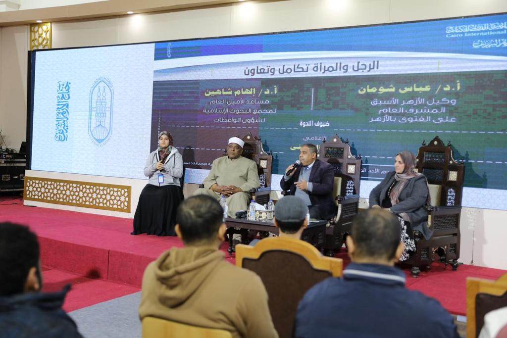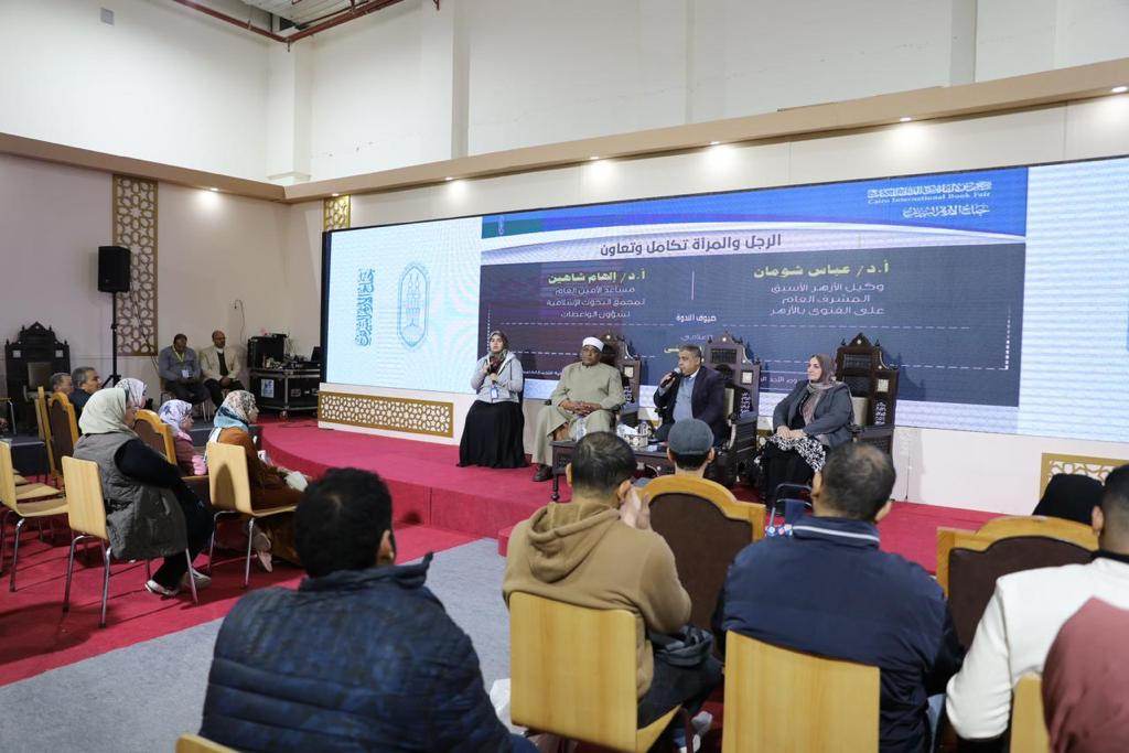 نظم جناح الأزهر الشريف بمعرض القاهرة الدولي للكتاب في نسخته 54، اليوم الأحد، ندوة تثقيفية حول طبيعة العلاقة بين الرجل والمرأة بعنوان: الرجل والمرأة تكامل وتعاون، ناقش فيها فضيلة الدكتور عباس شومان، وكيل الأزهر الأسبق، والدكتورة إلهام شاهين، مساعد الأمين العام لمجمع البحوث الإسلامية لشؤون الواعظات، وأدار الندوة الإذاعي القدير الأستاذ سعد المطعني.