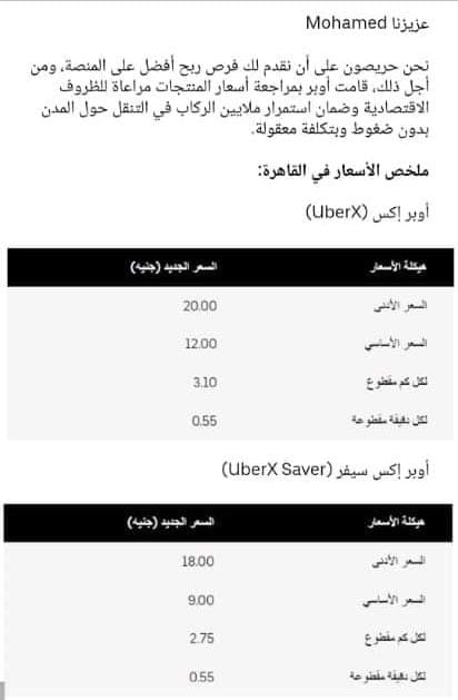 وقالت شركة أوبر، إنها راجعت أسعار المنتجات مراعاة للظروف الاقتصادية، وضمان استمرار ملايين الركاب في التنقل حول المدن بدون ضغوط وبتكلفة معقولة، مؤكدة حرصها على تقديم فرص ربح أفضل على المنصة.