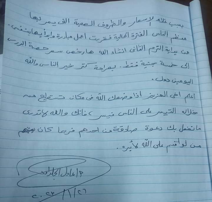 بداية من الترم الثاني هرخص سعر الحصة.. بهذه الكلمات تداولت ورقة لمعلم رياضيات عبر صفحته الرسمية على موقع التواصل الاجتماعي فيس بوك، حيث قال المعلم: بسبب غلاء الأسعار والظروف الصعبة التي يمر بها معظم الناس الفترة الحالية، فقررت أعمل مبادرة من بداية الترم الثاني هرخص سعر حصة الدرس إلى 5 جنيهات فقط.