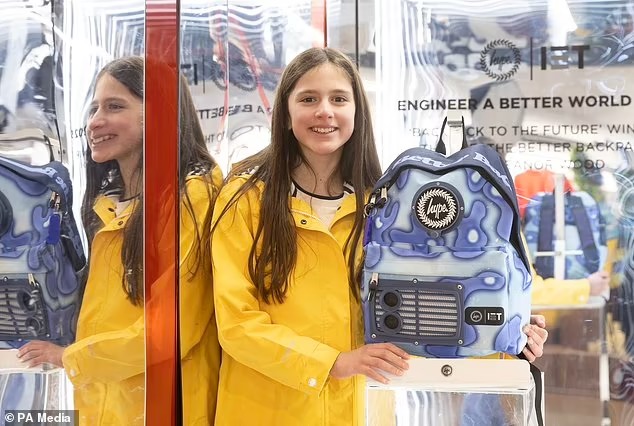 إليانور وودز، البالغة من العمر 12 عامًا، عرضت حقيبتها المبتكرة في مسابقة، بعد أن جعلت من والدتها نموذج لها في غرفتها، وفازت بالجائزة عن حقيبتها والتي تدور حول الحفاظ على أمان العائلة من خلال استخدام منقي الهواء.