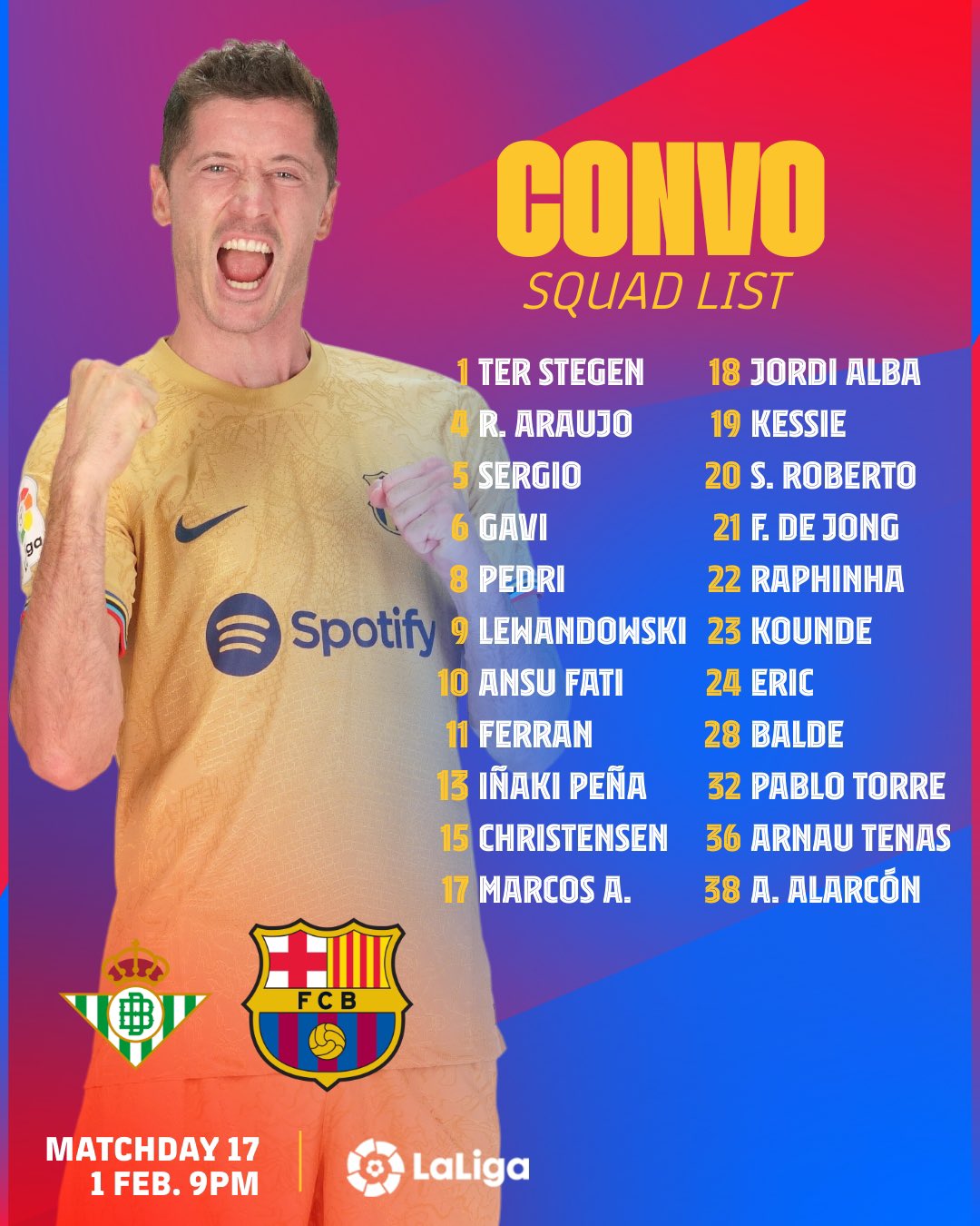وشهدت قائمة برشلونة لمواجهة ريال بيتيس في الليجا عودة النجم البولندي روبرت ليفاندوفسكي، بعد انتهاء إيقافه الذي استمر 3 مباريات.