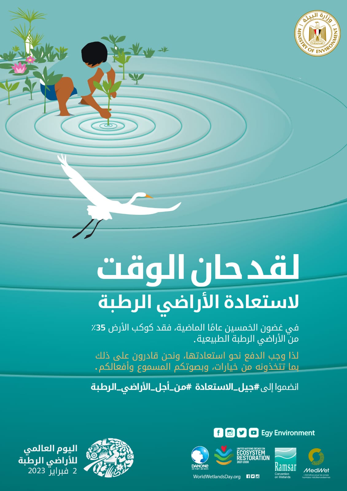 تشارك مصر العالم الاحتفال باليوم العالمي للأراضي الرطبة والذى يوافق 2 فبراير من كل عام، ويحمل هذا العام شعار إحياء الأراضي الرطبة المتدهورة واستعادتها، وذلك في إشارة إلى أهمية الأراضي الرطبة لبقاء الحياة على كوكب الأرض والتصدي لآثار التغيرات المناخية.