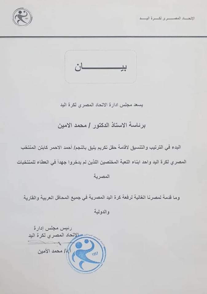 ونشر الاتحاد المصري لكرة اليد برئاسة محمد الأمين، بيانًا، يفيد بالبدء في الترتيبات لإقامة حفل لأحمد الأحمر لاعب منتخب مصر، والذي اعتزل اللعب دوليًا قبل انطلاق منافسات بطولة العالم لكرة اليد التي أقيمت في الفترة من 11 حتى 29 يناير.