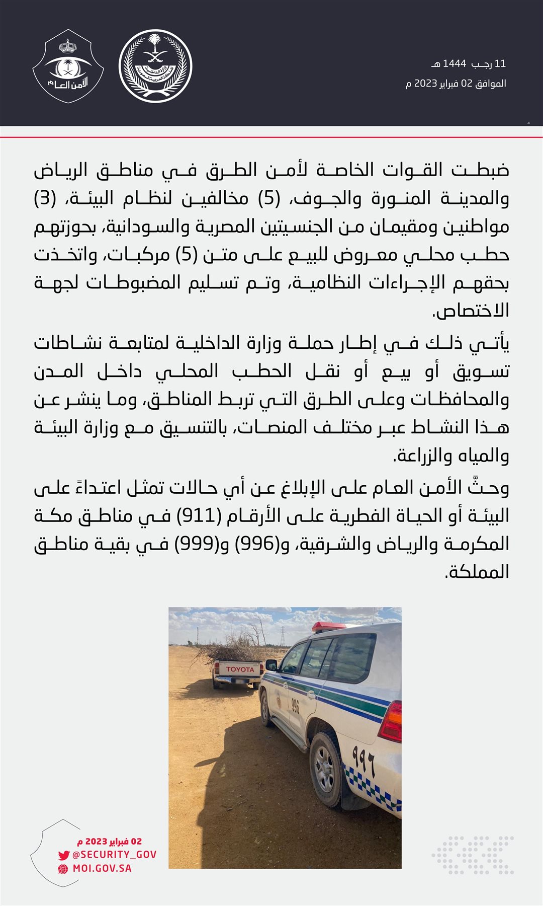 وأوضح بيان الأمن العام السعودي أن ذلك يأتي في إطار حملة وزارة الداخلية السعودية لمتابعة نشاطات تسويق أو بيع أو نقل الحطب المحلي داخل المدن والمحافظات وعلى الطرق التي تربط المناطق، وما ينشر عن هذا النشاط عبر مختلف المنصات بالتنسيق مع وزارة البيئة والمياه والزراعة.