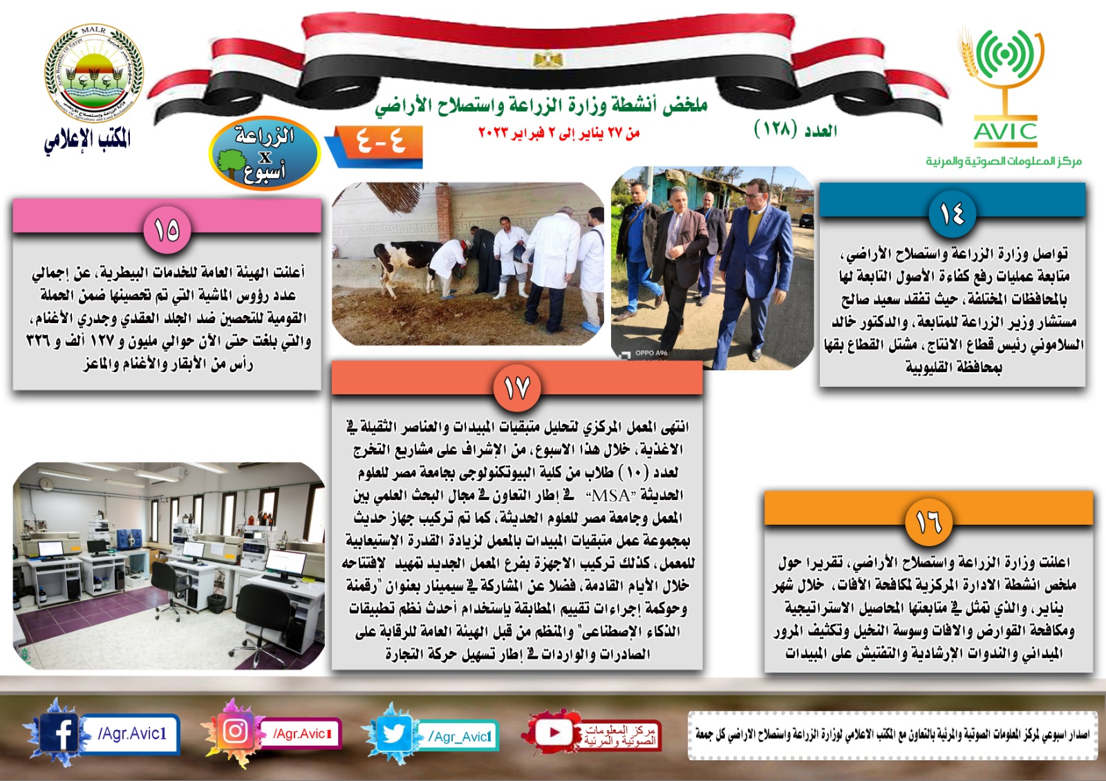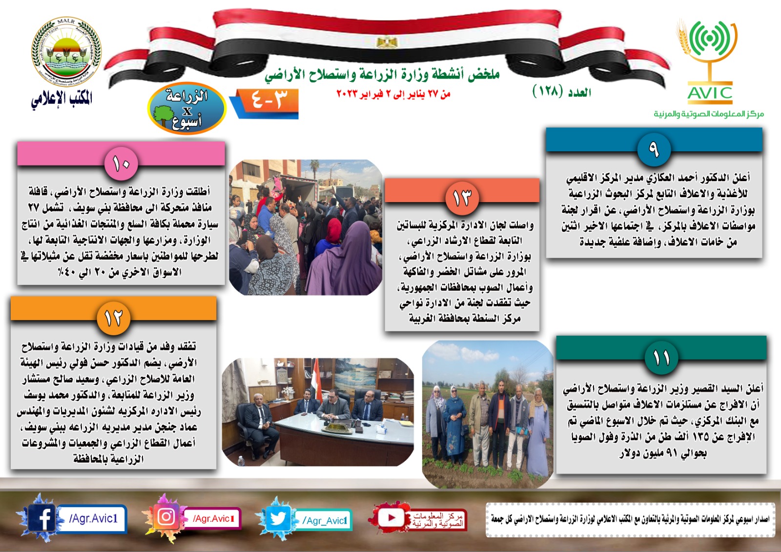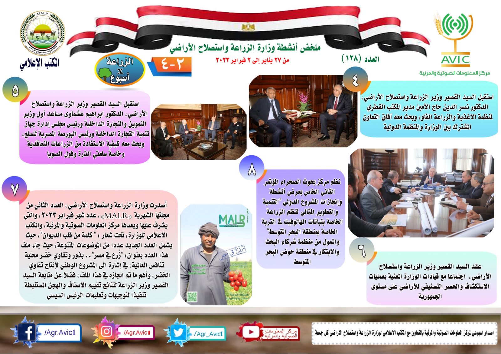 أصدر مركز المعلومات الصوتية والمرئية، التابع لـ وزارة الزراعة واستصلاح الأراضي، "الانفوجراف الأسبوعي" في نسخته رقم 128، حول الحصاد الأسبوعي لأهم أنشطة الوزارة، خلال الأسبوع الماضي في الفترة من 27 يناير إلى 2 فبراير الجاري.