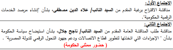 بينما تدرس اللجنة خلال اجتماعها الثاني في نفس اليوم، مناقشة طلب المناقشة العامة المقدم من النائب ناجح جلال، بشأن استيضاح سياسة الحكومة بشأن الإجراءات التي اتخذتها لتطوير قطاع الاتصالات ودعم جهود التحول الرقمي للدولة المصرية.