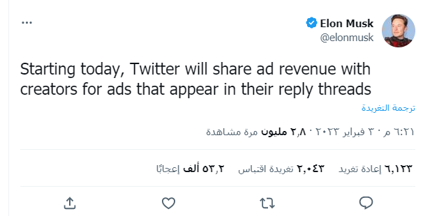 أعلن إيلون ماسك مالك شركة تويتر في تغريدة له اليوم الجمعة على تويتر توزيع عائدات الإعلانات على بعض صانعي المحتوى في تويتر وقال عبر تغريدته التي نشرها عبر حسابه الشخصي الذي يتابعه 127.8 مليون متابع حول العالم وأنه بدءًا من اليوم، سيشارك تويتر Twitter عائدات الإعلانات مع منشئي وصانعي المحتوى.