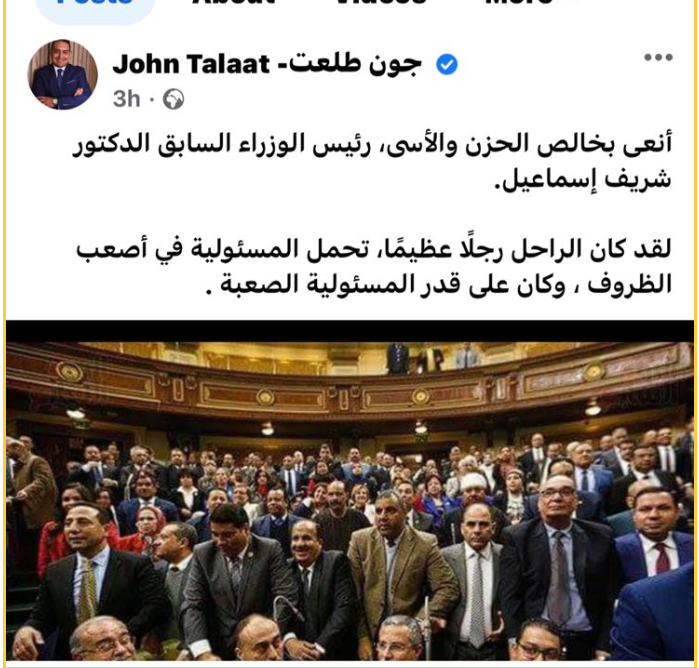 وقال البرلماني السابق جون طلعت خلال صفحته الرسمية على موقع التواصل الاجتماعي فيس بوك: أنعى بخالص الحزن والأسى رئيس الوزراء السابق الدكتور شريف إسماعيل، متابعًا: لقد كان الراحل رجلًا عظيمًا، تحمل المسئولية في أصعب الظروف، وكان على قدر المسئولية الصعبة.