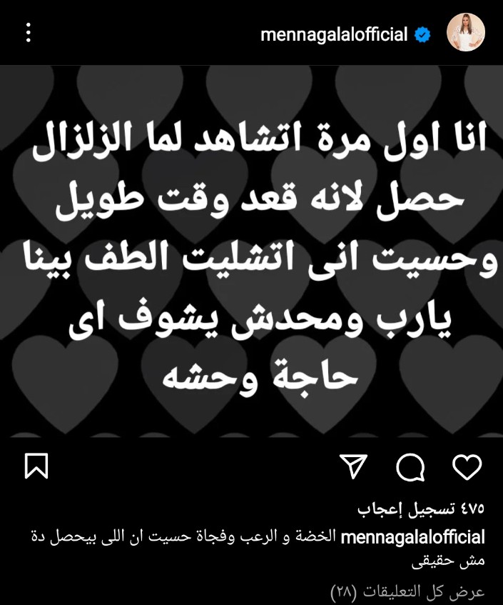 وكتبت منة جلال منشورًا، عبر حسابها الشخصي بموقع تبادل الصور والفيديوهات انستجرام، قالت فيه: أنا أول مرة أتشاهد لما الزلزال حصل، لأنه بعد وقت طويل وحسيت أني أتشليت، ألطف بينا يارب ومحدش يشوف حاجة وحشة، الخضة والرعب وفجأة حسيت إن اللي بيحصل ده مش حقيقي.