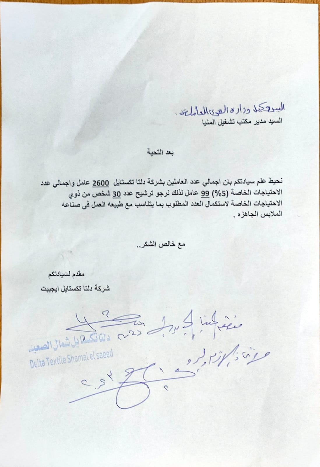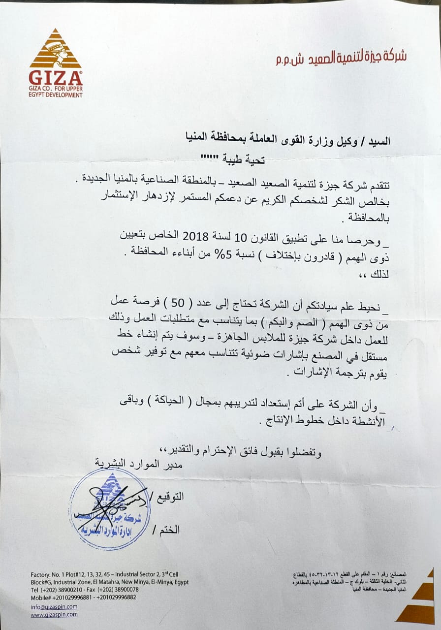 أعلنت وزارة القوى العاملة عن فرص عمل جديدة لذوي الهمم في محافظة المنيا، حيث تلقى حسن شحاتة، وزير القوى العاملة، اليوم اليوم الثلاثاء تقريرًا من مديرية القوى العاملة بمحافظة المنيا، بشأن استلامها طلبًا من شركتي جيزة لتنمية الصعيد، والمتخصصة لصناعة الملابس الجاهزة، والدلتا تكستايل الكائنة في شمال الصعيد ومتخصصة في لصناعة الملابس الجاهزة بالمنطقة الصناعية بالمنيا الجديدة.