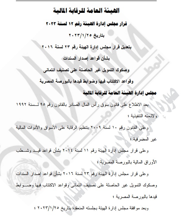 نشرت الجريدة الرسمية اليوم الثلاثاء 7-2-2023، قرار الهيئة العامة للرقابة المالية، رقم 12 لسنة 2023، بتعديل قرار مجلس إدارة الهيئة رقم 23 لسنة 2016، بشأن قواعد إصدار السندات، وصكوك التمويل غير الحاصلة على تصنيف ائتماني، وقواعد الاكتتاب فيها وضوابط قيدها بالبورصة المصرية.