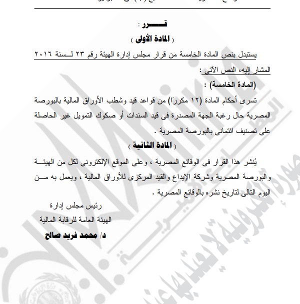 وذكرت الجريدة في عددها الصادر اليوم، أنه بعد الاطلاع على عدة قوانين، قرر أن يستبدل بنص المادة الخامسة من قرار مجلس إدارة الهيئة رقم 23 لسنة 2016، وهو: المادة الخامسة: تسرى أحكام المادة 12 مكررا من قواعد قيد وشطب الأوراق المالية بالبورصة المصرية حال رغبة الجهة المصدرة فى قيد السندات أو صكوك التمويل غير الحاصلة على تصنيف ائتماني بالبورصة المصرية.