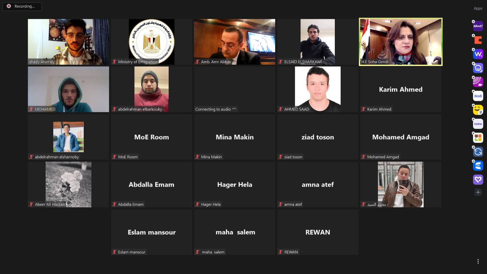 عقدت السفيرة سها جندي، وزيرة الدولة للهجرة وشئون المصريين بالخارج، لقاء افتراضيا للاطمئنان على أبناء الجالية المصرية في تركيا، بعد توابع الكارثة الإنسانية التي لحقت بعدد من الدول، وذلك بمشاركة السفير عمرو عباس، مساعد وزيرة الهجرة للجاليات، والطالب شادي السروي ممثل مركز حوار وزارة الهجرة لشباب الدارسين وشباب من الدارسين والطالب بكلية العلوم قسم الفيزياء، جامعة أنقرة وعدد من الطلاب الدارسين في مختلف الولايات التركية.