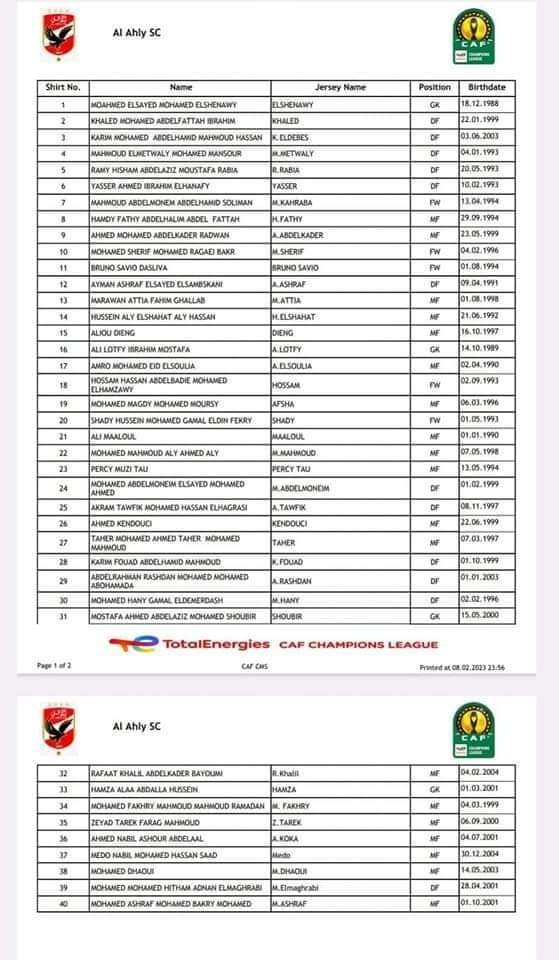 وقيد الأهلي كلا من: محمود كهربا، إلى جانب الرباعي الوافد حديثًا لصفوف القلعة الحمراء في انتقالات الشتاء خالد عبد الفتاح ومروان عطية إلى جانب أحمد القندوسي ومحمد الضاوي كريستو لقائمته الإفريقية.