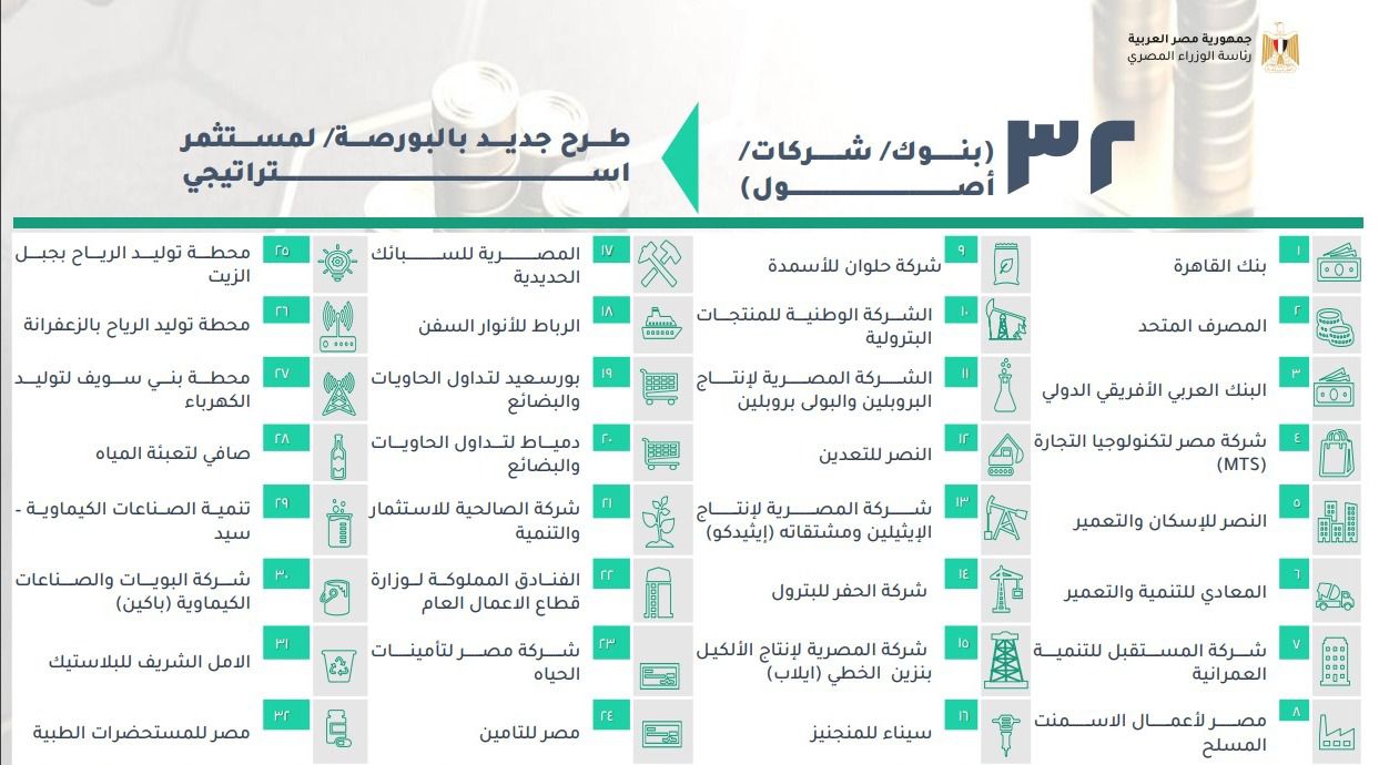 رحب رامي الدكاني رئيس البورصة المصرية بإعلان رئيس الوزراء الدكتور مصطفى مدبولي أمس، قائمة الشركات الحكومية التي تعتزم الدولة توسيع قاعدة ملكياتها وفقا لبرنامج الطروحات الحكومية خلال الفترة المقبلة.
