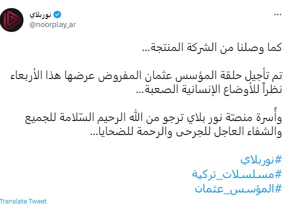 وقالت المنصة: كما وصلنا من الشركة المنتجة، تم تأجيل حلقة المؤسس عثمان المفروض عرضها هذا الأربعاء نظرًا للأوضاع الإنسانية الصعبة، وأُسرة منصّة نور بلاي ترجو من الله الرحيم السّلامة للجميع والشفاء العاجل للجرحى والرحمة للضحايا.