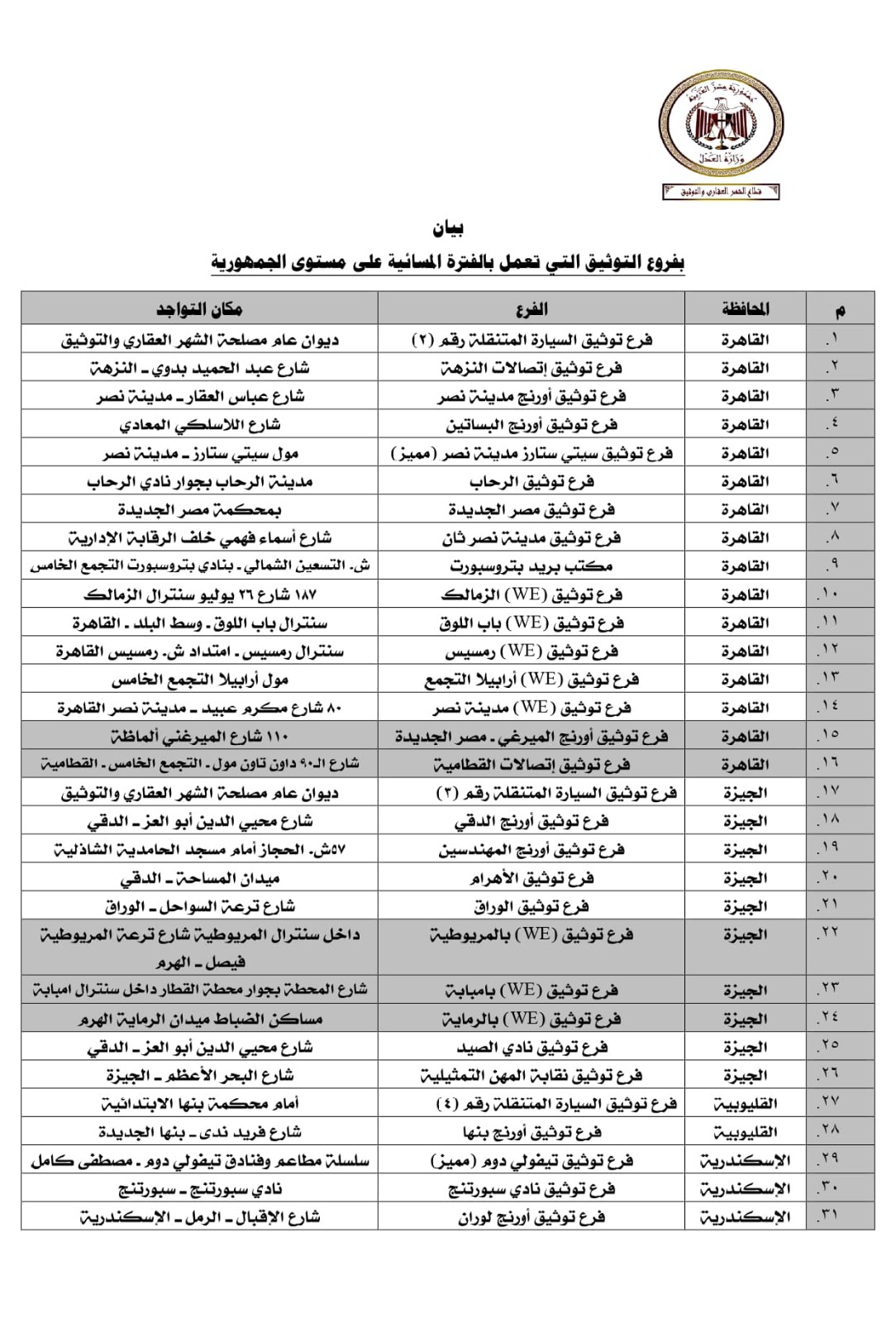 أصدر المستشار عمر مروان وزير العدل، عدة قرارات وزارية بافتتاح 12 فرع توثيق جديد في فروع شركات اتصالات مصر - أورانج - وي في 9 محافظات وهي «القاهرة – الجيزة – المنوفية – الشرقية – الدقهلية – الإسماعيلية – بني سويف – أسيوط – سوهاج» وإتاحة العمل بها في الفترة المسائية ليصبح إجمالي عدد الفروع التي تعمل خلال الفترة المسائية 94 فرعا وذلك من الساعة الخامسة مساءً حتى الساعة التاسعة مساءً، وكذا افتتاح 4 فروع توثيق أخرى جديدة في محافظة الإسكندرية.