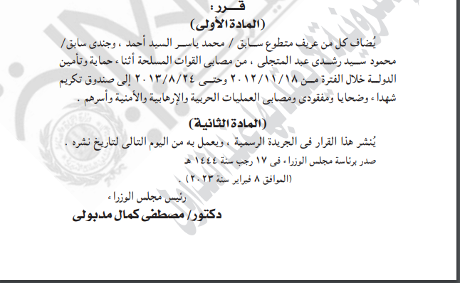 الجريدة الرسمية تنشر قرار رئيس الوزراء بإضافة شخصين لصندوق تكريم الشهداء ومصابي العمليات الحربية والإرهابية