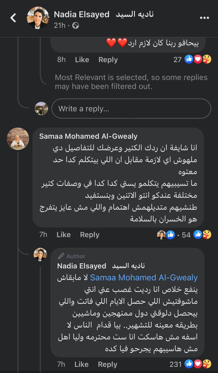 وردت الشيف نادية السيد على صفحتها، على تلك الاتهامات اليوم في بوست لها قائله: والله العظيم أنا شيرت البوست ده علشان في متابعة كتبتلي أنا كنت على وشك اغير نظرتي ليكي من كتر ما بيشتمو فيكي اليومين دول كويس انك رديتي دافعتي عن نفسك، للدرجادي عاوزين يشوهوا صورتي علشان بدافع عن حقي، أنا عمري مارديت على الناس اللي بتشتم فيا بس أنا فايتر، ومش هاسيب حقي بردو وأنا رديت عليهم في البوست.