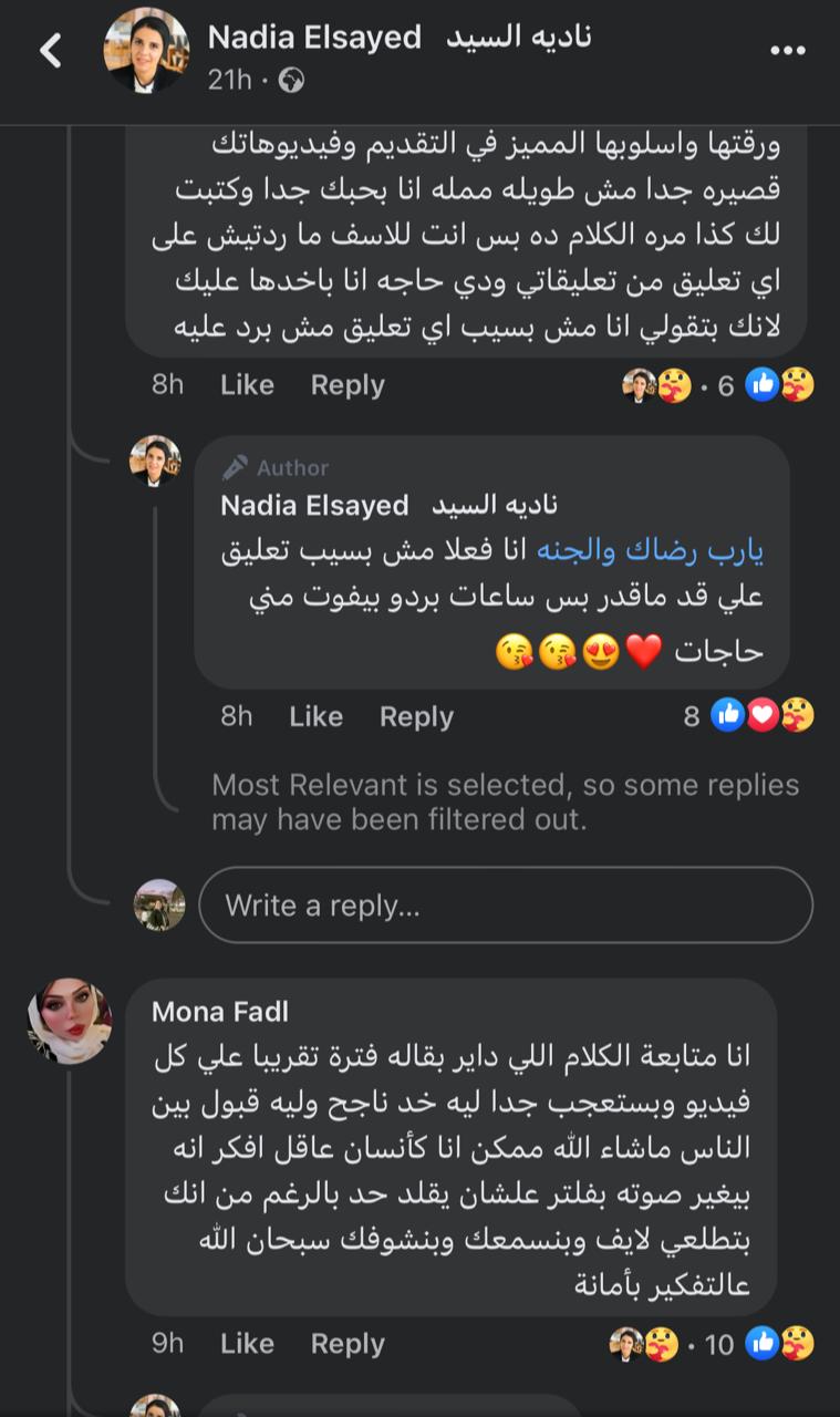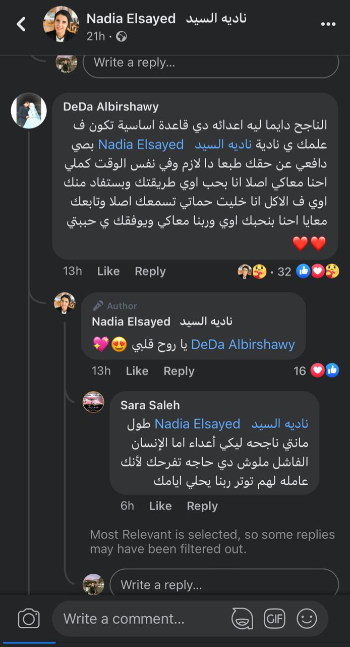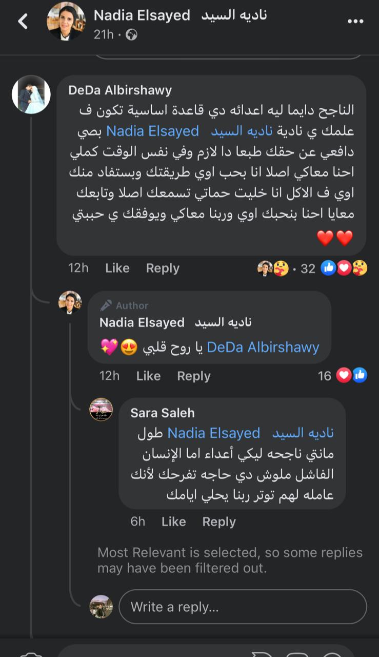 وتفاعل جمهور الشيف نادية السيد مع البوست بشكل واسع، وكتبوا لها عدد كبير من التعليقات الداعمة لها والمحفزة.