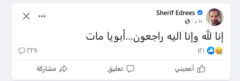 واكتفى شريف إدريس بإعلان وفاة والده، عبر حسابه الشخصي على موقع التواصل الاجتماعي، فيسبوك: إنا لله وإنا إليه راجعون.. أبويا مات.
