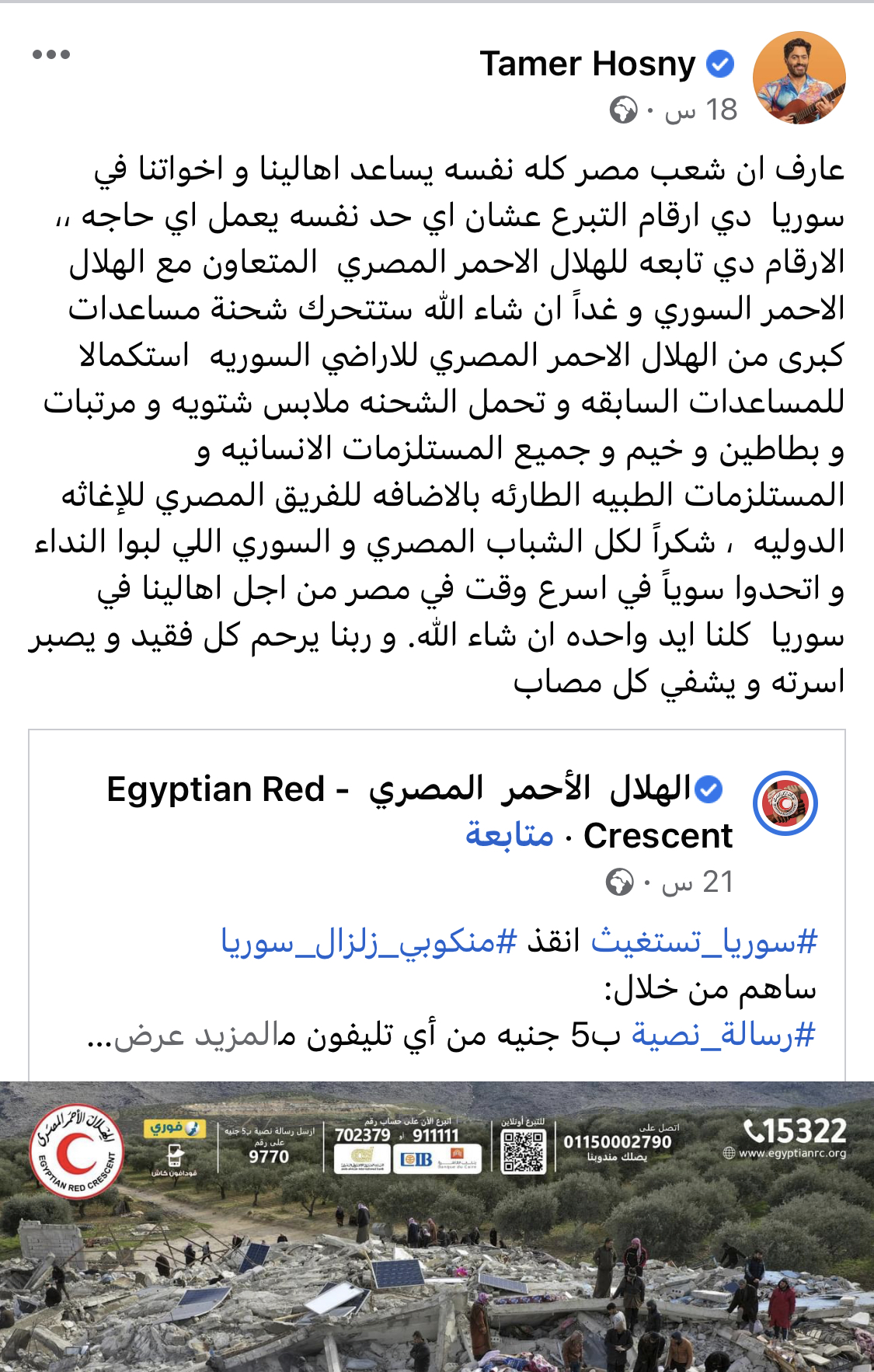 ونشرت مؤسسة الهلال الأحمر بوست عبر حسابها الشخصي على فيس بوك تشكر فيه الفنان تامر حسني على دعمه ومساندته لمؤسسة الهلال الأحمر المصري في توضيب المواد المرسلة لـ ضحايا آسر الشعب السوري عقب الزلزل الذي ضرب البلاد مؤخرًا.