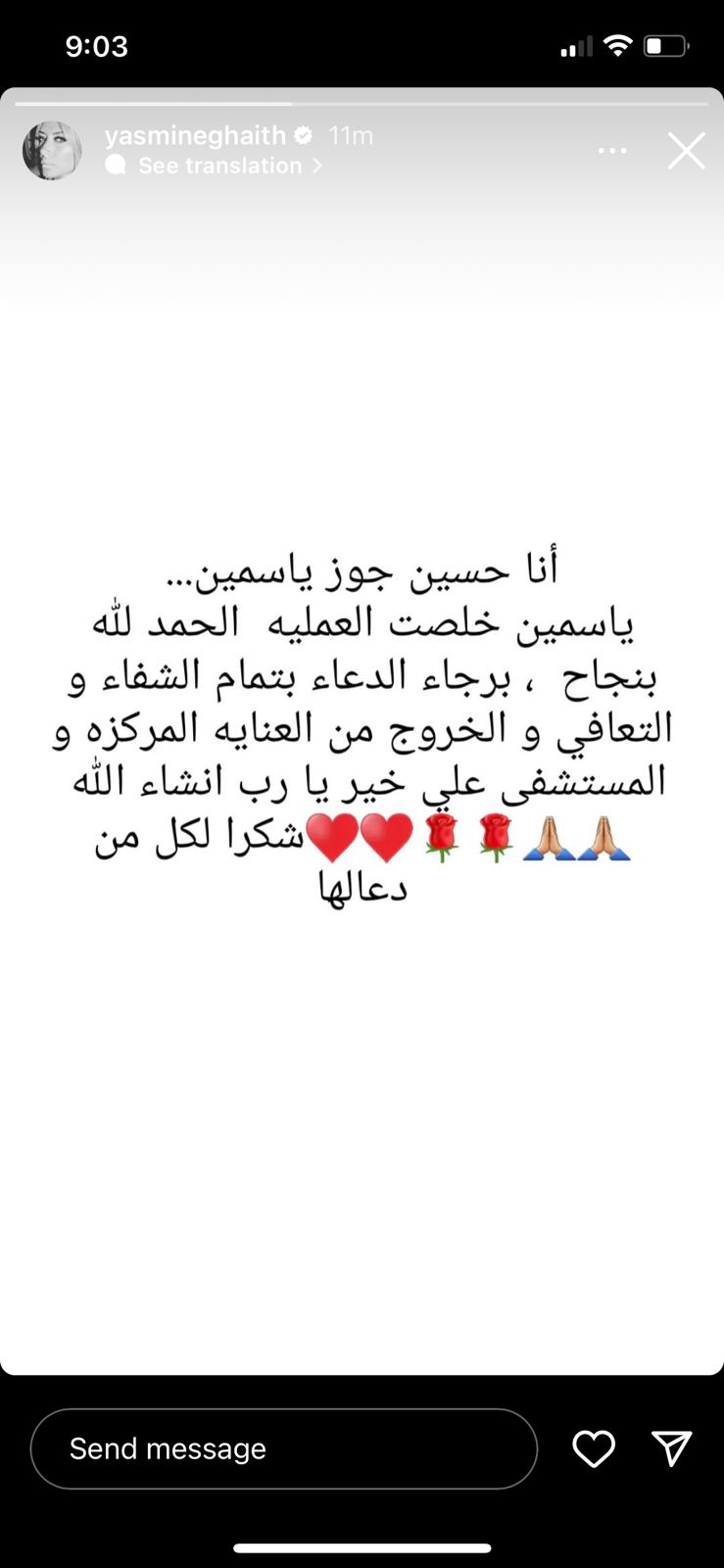 ونشر زوج الفنانة ياسمين غيث، ستوري عبر حسابها الشخصي بموقع الصور والفيديوهات إنستجرام، ليطمئن جمهورها، قائلًا: أنا حسين جوز ياسمين.. ياسمين خلصت العملية بنجاح، برجاء الدعاء بتمام الشفاء والتعافي، والخروج من العناية المركزة في المستشفى، يا رب إن شاء الله، وشكرًا لكل من دعا لها.