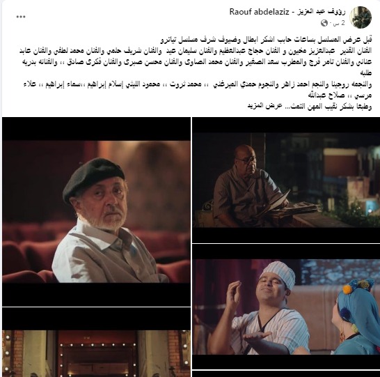 ونشر رؤوف عبد العزيز عبر حسابه على فيس بوك، العديد من الصور من كواليس تصوير النجوم ضيوف الشرف، مشاهدهم بالعمل، وعلق عليها، قائلا: قبل عرض المسلسل بساعات حابب أشكر أبطال وضيوف شرف مسلسل تياترو، الفنان القدير عبدالعزيز مخيون والفنان حجاج عبدالعظيم والفنان سليمان عيد والفنان شريف حلمي والفنان محمد لطفى والفنان عابد عناني والفنان تامر فرج والمطرب سعد الصغير والفنان محمد الصاوي والفنان محسن صبري والفنان فكري صادق، والفنانة بدرية طلبة.