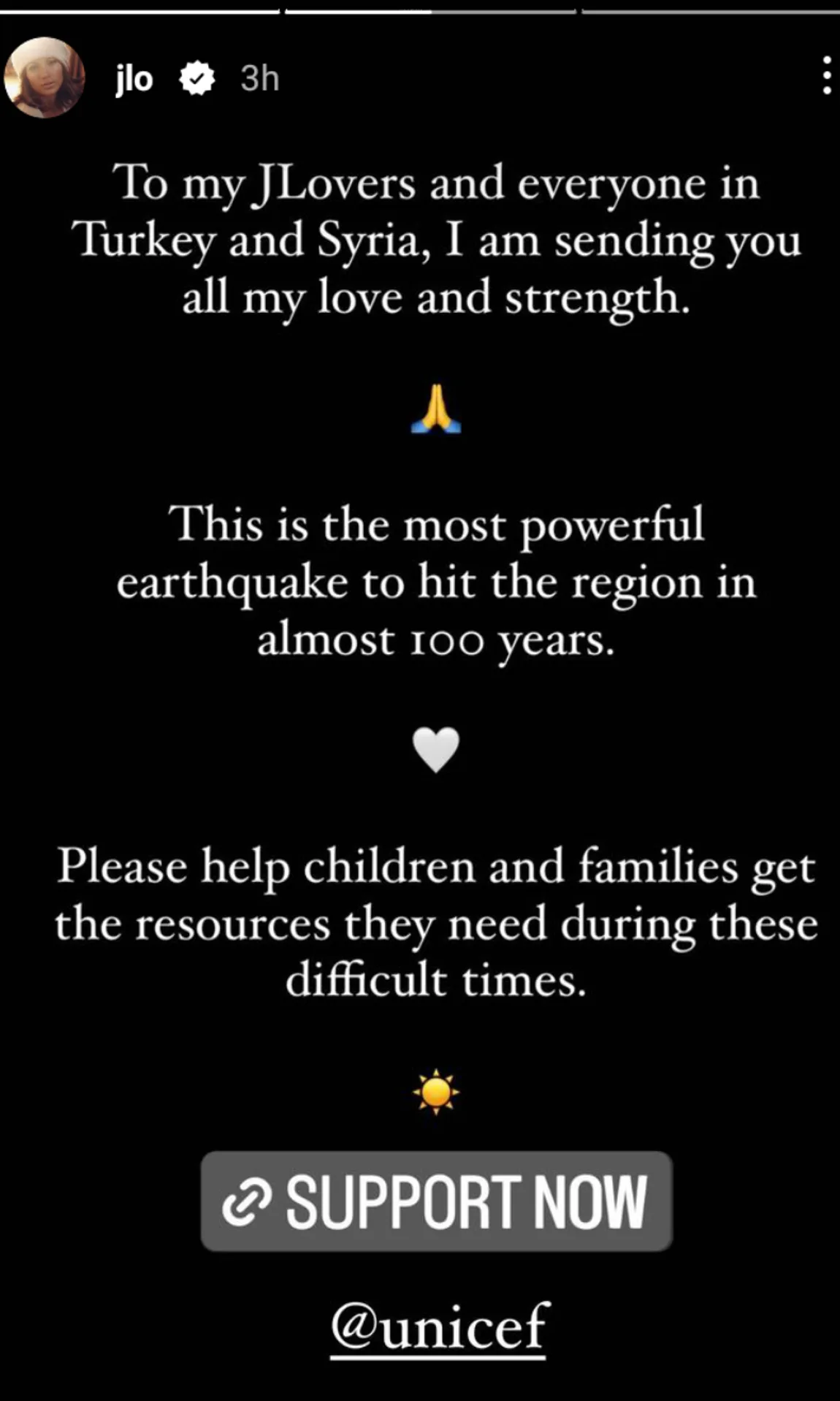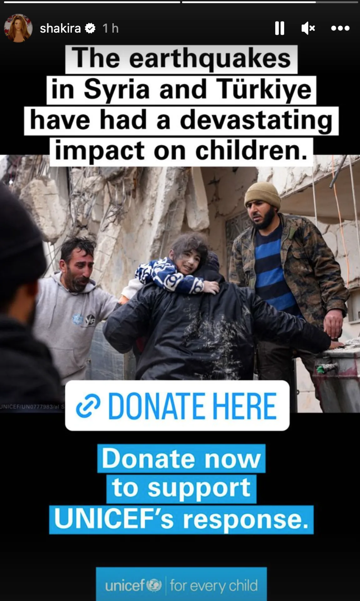 طالبت جنيفير لوبيز جميع متابعيها ومحبيها بضرورة التبرع لضحايا زلزال تركيا وسوريا، وسارت شاكيرا على نهج جنيفير لوبيز، حيث دعت متابعيها للتبرع لضحايا زلزال تركيا وسوريا قائلة: الزلازل في سوريا وتركيا كان له أثر مدمر على الأطفال.