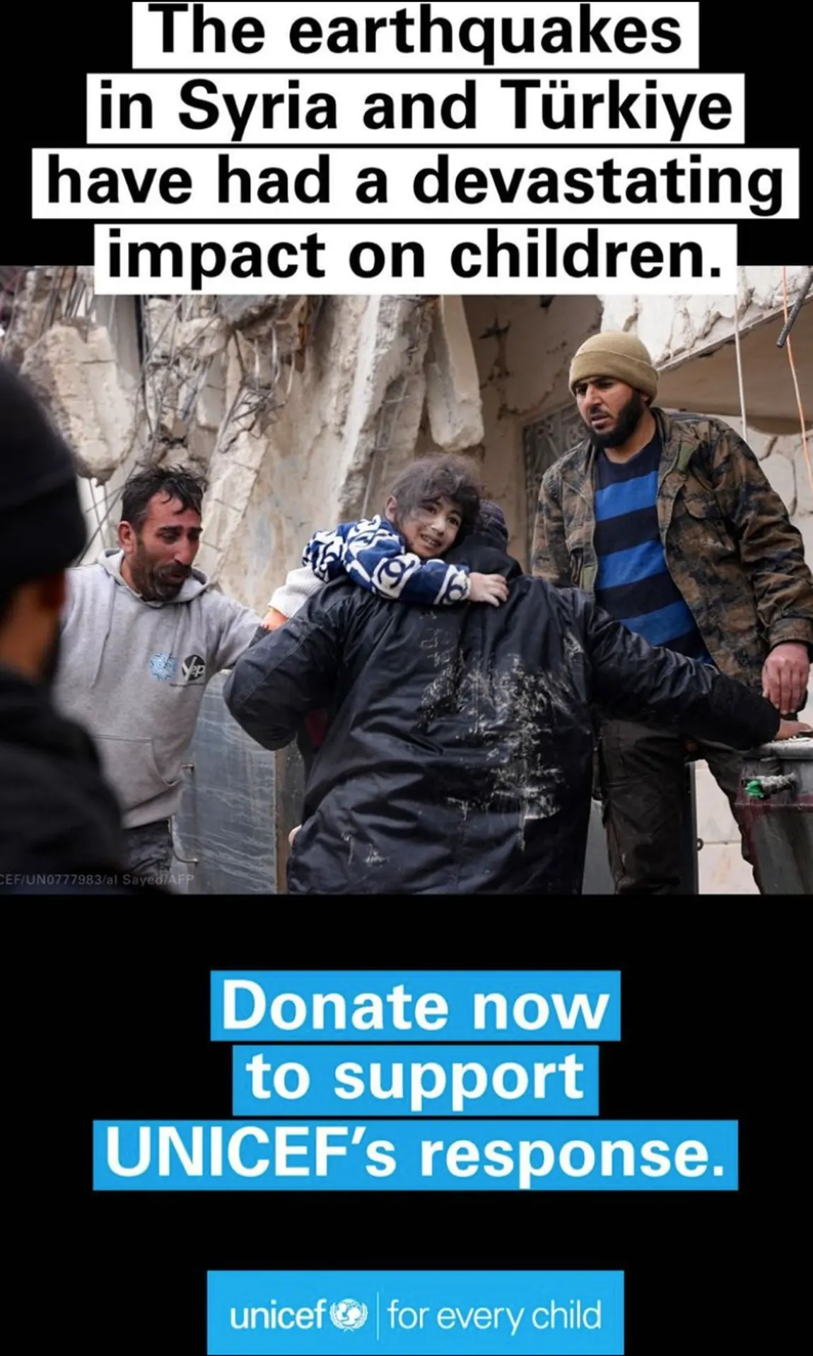 ناشد النجم أورلاندو بلوم بضرورة التبرع لحملة منظمة يونيسف الرسمية لدعم ضحايا زلزال تركيا وسوريا قائلًا: قلبي ينفطر على كل من تضرر من الزلزال المدمر في سوريا وتركيا، والجدير بالذكر معروف بمساعداته الإنسانية الكثيرة، وتم اختياره ليكون سفيرًا لـ منظمة يونيسف.