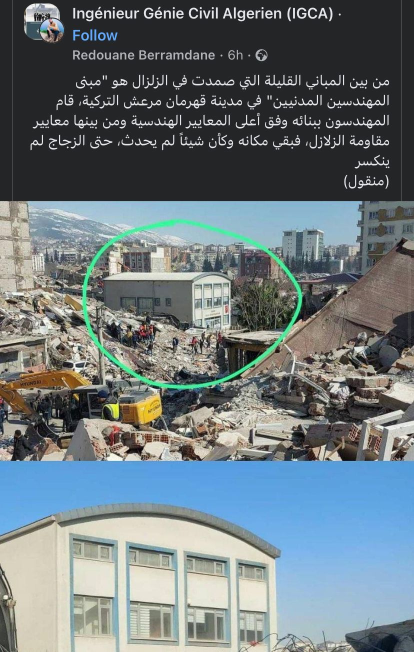 وجاء في منشور آخر، نحن كـ بشر عنا استهتار وما منهتم بمعايير السلامة، ودائمًا تكون العواقب وخيمة.. من بين المباني القليلة التي صمدت في الزلزال هو مبنى المهندسين المدنيين في قهرمان مرعش بتركيا.