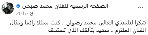 وكان أشاد الفنان محمد صبحي بالفنان محمد رضوان، ووجه له رسالة شكر، وذلك من خلال حسابه الشخصي بموقع التواصل الاجتماعي فيس بوك، حيث قال: شكرًا لتلميذي الغالي محمد رضوان.. كنت ممثلًا رائعًا ومثال لـ الفنان الملتزم.. سعيد بتألقك الذي تستحقه.