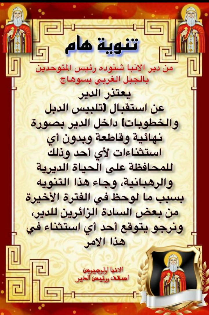 أعلن دير الأنبا شنودة رئيس المتوحدين بالجبل الغربي بسوهاج عن عدم استقبال حفلات الخطوبة أو أي مراسم خاصة بالأفراح والأكاليل بصورة نهائية وقاطعة.