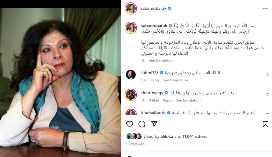 وتابعت صبا: بفائق الحزن نتقدم بكامل الأسى بإعلان وفاة المرحومة والمغفور لها خالتي هيفاء داوود الآغا انتقلت الى رحمة الله من ساعات قليلة.. ونسألكم الدعاء لها بالرحمة والغفران.