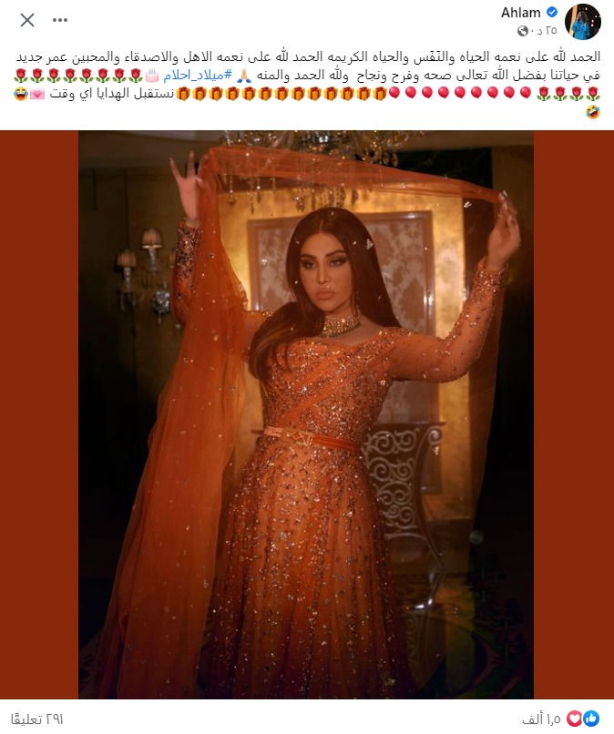ونشرت أحلام الصورة عبر حسابها الشخصي بموقع التواصل الاجتماعي فيس بوك، وعلقت عليها قائلة: الحمد لله على نعمة الحياة والنَفَس، والحياة الكريمة الحمد لله على نعمة الأهل والأصدقاء والمحبين، عمر جديد في حياتنا بفضل الله تعالى، صحة وفرح ونجاح ولله الحمد والمنة.. عيد ميلاد أحلام.. بقبل الهدايا بأي وقت.