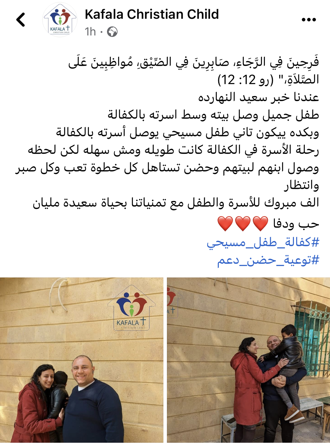 أعلنت مبادرة كفالة طفل مسيحي، منذ قليل، نجاح كفالة طفل مسيحي جديد، ليصبح الثاني في مصر، وتصبح الأسرة الكافلة، ثاني أسرة مسيحية كافلة في مصر.