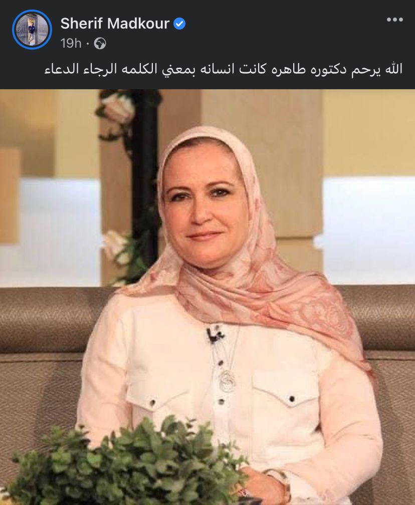 وعلى رأسهم الإعلامي شريف مدكور، حيث كتب في منشور له عبر صفحته الشخصية بموقع فيسبوك: الله يرحم الدكتورة طاهرة كانت إنسانة بمعنى الكلمة الرجاء الدعاء لها.