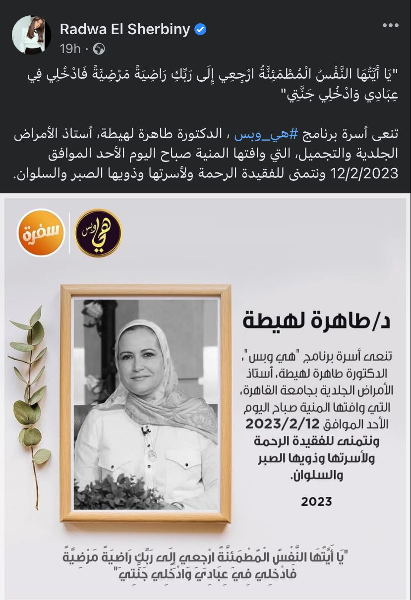 كما نعتها الإعلامية رضوى الشربيني: حيث كتبت عبر صفحتها الرسمية بموقع فيسبوك: يا أيتها النفس المطمئنة ارجعي إلى ربك راضية مرضية فادخلي في عبادي وادخلي جنتي، تنعى أسرة برنامج هي وبس الدكتورة طاهرة لهيطة، أستاذ الأمراض الجلدية والتجميل، التي وافتها المنية اليوم الأحد، ونتمنى للفقيدة الرحمة ولأسرتها وذويها الصبر والسلوان.