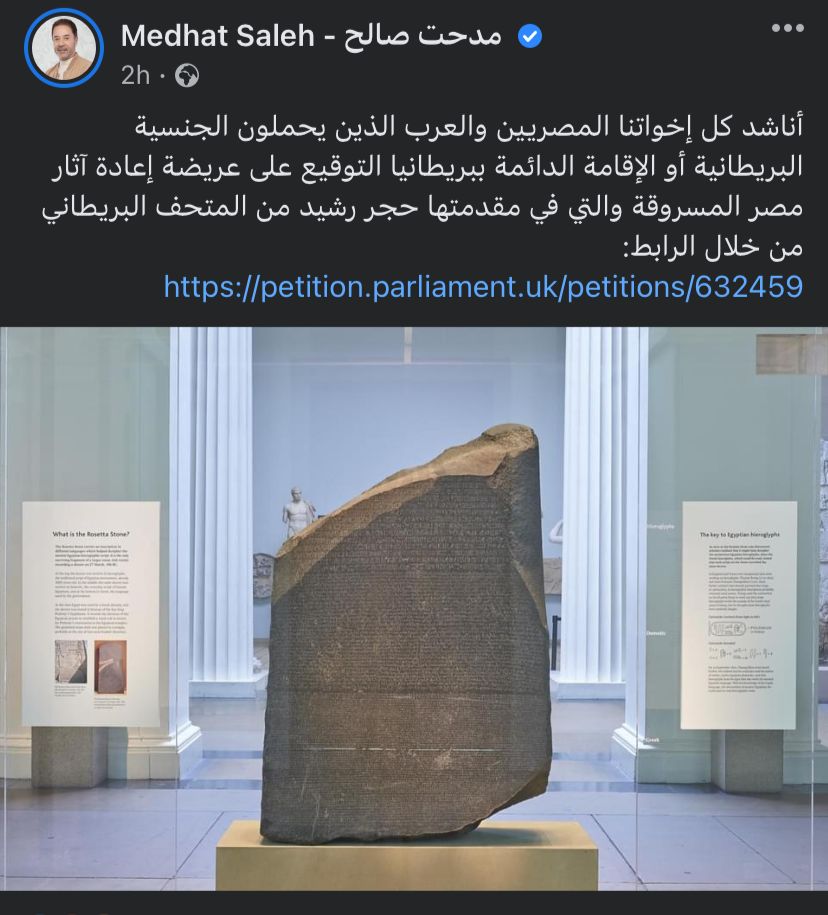 وكتب مدحت صالح منشورًا عبر حسابه الشخصي بموقع التواصل الاجتماعي فيسبوك جاء فيه: أناشد كل إخواتنا المصريين والعرب الذين يحملون الجنسية البريطانية أو الإقامة الدائمة ببريطانيا التوقيع على عريضة إعادة آثار مصر المسروقة والتي في مقدمتها حجر رشيد من المتحف البريطاني.