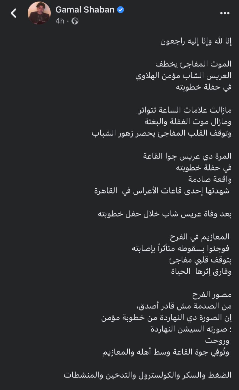ومن جانبه، قال الدكتور جمال شعبان، عميد المعهد القومي للقلب السابق، من خلال منشور له عبر صفحته الرسمية بموقع فيس بوك، إنا لله وإنا إليه راجعون الموت المفاجئ يخطف العريس الشاب مؤمن الهلاوي في حفلة خطوبته، مازالت علامات الساعة تتواتر، ومازال موت الغفلة والبغتة.