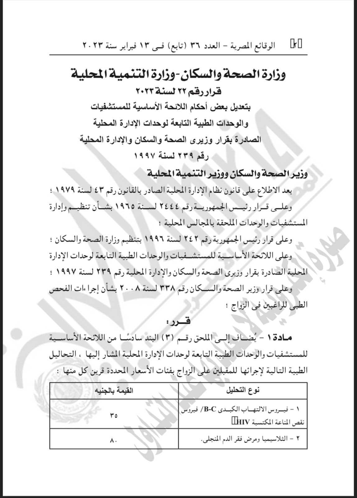 وقررت المادة الأولى من القرار تسعير تحليل فيروس الالتهاب الكبدى B-C، وفيروس نقص المناعة المكتسبة في الوحدات الطبية والمستشفيات للمقبلين على الزواج بـ 35 جنيها، وتحليل الثلاسيميا ومرض فقر الدم المنجلى بـ 80 جنيها.