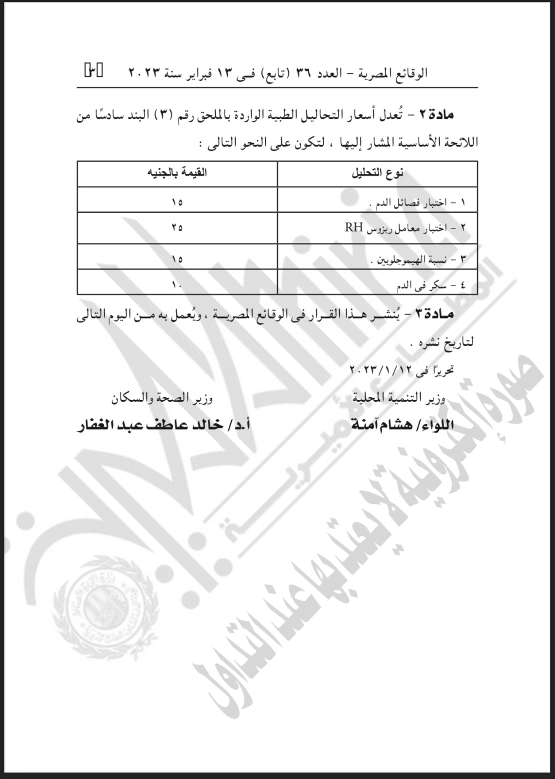 وعدلت المادة الثانية من القرار أسعار بعض التحاليل، ليصبح اختبار فصائل الدم بـ 15 جنيها، واختبار معامل ریزوس RH بـ 25 جنيها، وتحليل نسبة الهيموجلوبين بـ 15 جنيها، وتحليل سكر في الدم بـ 10 جنيهات.