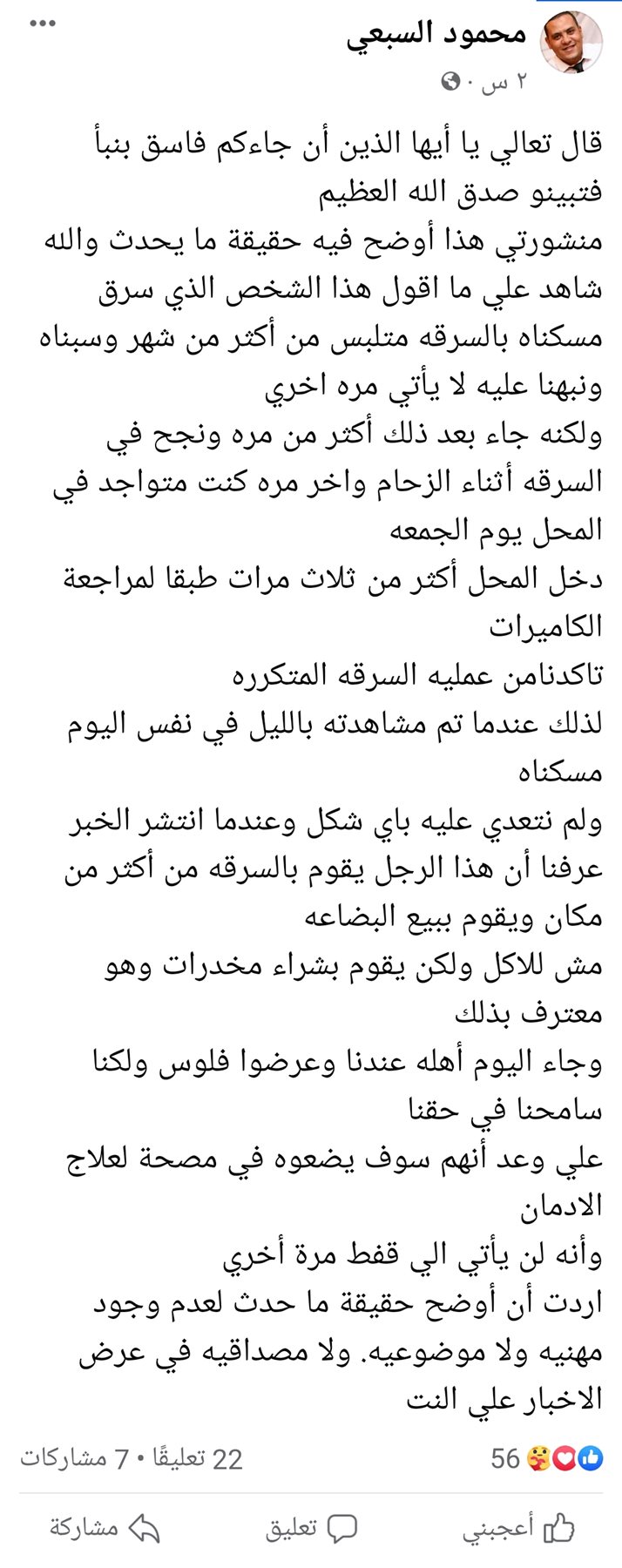 وأوضح السبعي عبر صفحته الشخصية على موقع التواصل الاجتماعي فيسبوك: منشوري هذا لتوضيح حقيقة ما يحدث والله شاهد على ما أقول، هذا الشخص الذي سرق مسكناه بالسرقه متلبس من أكثر من شهر وسبناه ونبهنا عليه لا يأتي مره أخرى، ولكنه جاء بعد ذلك أكثر من مرة ونجح في السرقة أثناء الزحام.