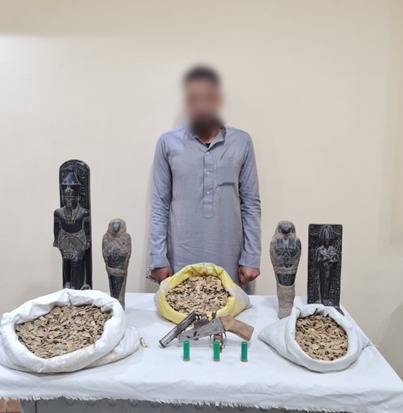 وبالفحص، تبين وجود خلافات مالية بين العامل ومالك مكتب المقاولات، وعقب تقنين الإجراءات تم استهداف الأخير وأمكن ضبطه حال تواجده بدائرة مركز شرطة الفيوم، وبحوزته فرد محل وعدد من الطلقات لذات العيار و4 تماثيل مقلدة وكمية من العملات الأثرية المقلدة وزنت 10 كيلو جرام، وتم اتخاذ الإجراءات القانونية.